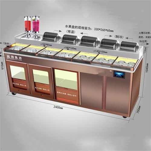 以滑蓋保鮮、風(fēng)冷保鮮、高溫+臭氧消毒功能,解決了醬料在常溫下開(kāi)放式存放、碗碟露天存放等食安隱患問(wèn)題;運用強大的智能操控系統,讓調料區管理更高效;支持多種功能、風(fēng)格定制,打造餐企專(zhuān)屬料臺。